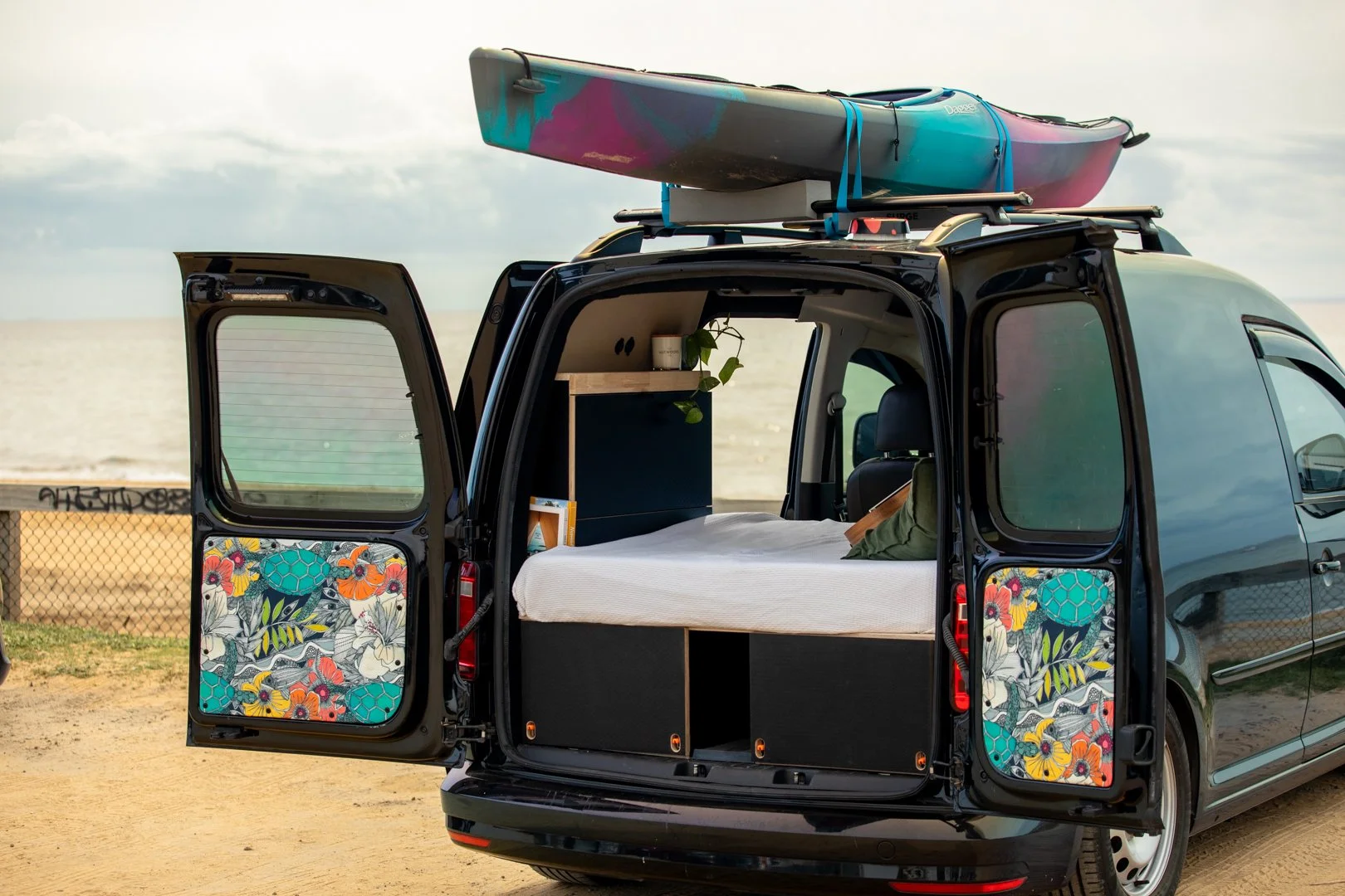 With the Minimalist 12v system, Carlos can stay off-grid for 2 days without driving or charging off solar. The Caddy wall panel kit keeps it light and stylish from front to back.
